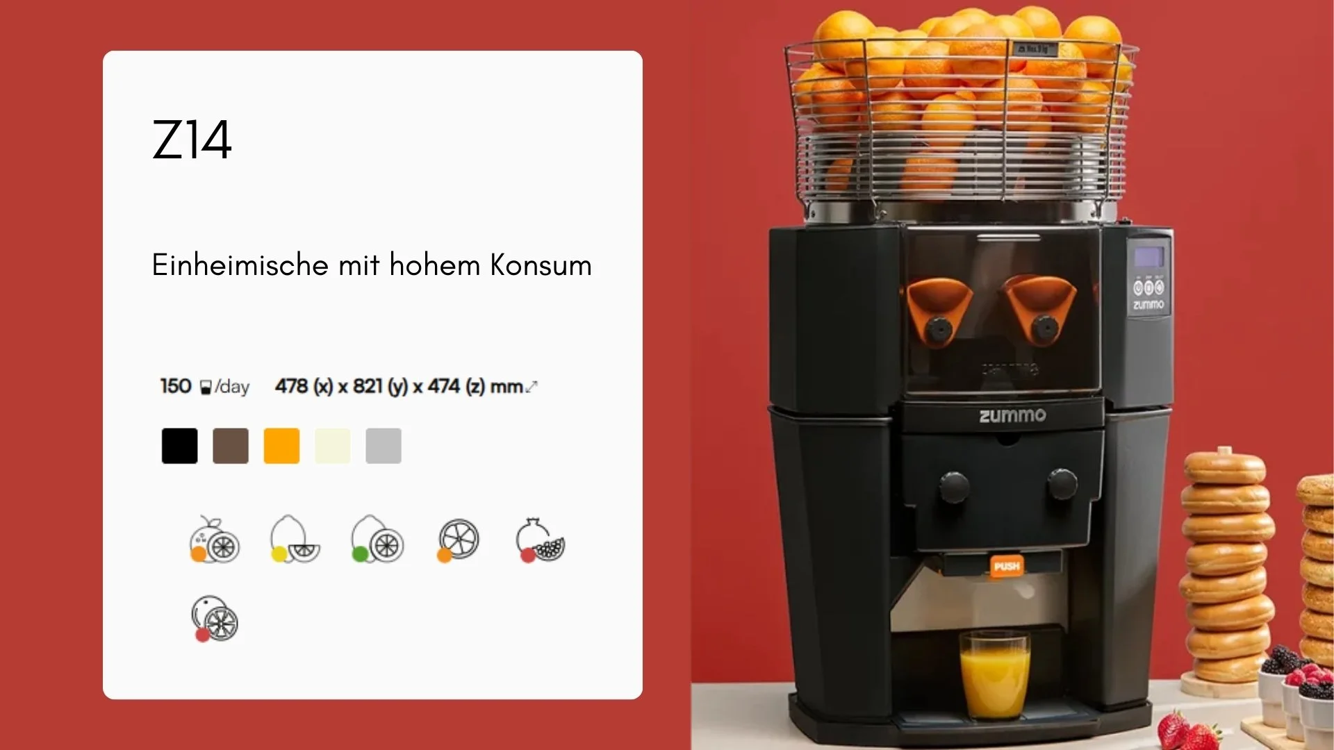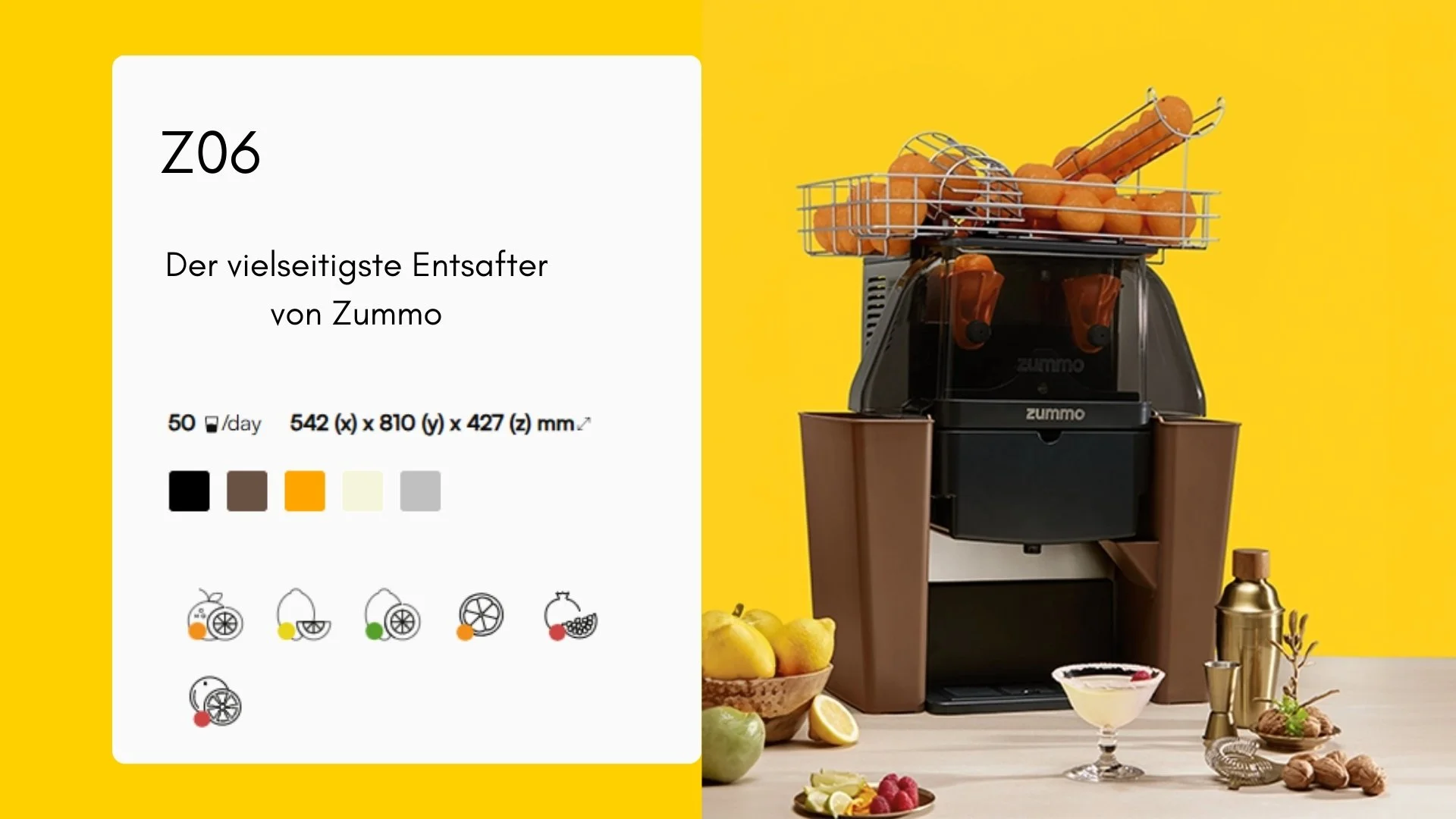 Im Jahre 1992 startete die spanische Firma Zummo Innovaciones Mecánicas mit Sitz in Valencia, ihre Suche nach der perfekten Saftpresse. Nach und nach wurde man zur globalen Größe in der Entwicklung und Produktion von automatischen Saftpressen. Der Verkauf erfolgt in über 90 Länder. Heute, seit mehr als 25 Jahre später, ist Zummo eine renommierte Firma, welche sich vor allem durch ihr einzigartiges Pressverfahren und höchste Qualität etabliert hat.