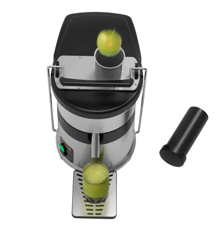 Hochproduktiver und leistungsstarker Saftentsafter für Obst und Gemüse mit angebrachtem Tresterbehälter – die ideale Wahl für die besten Saftkombinationen. Schnelle und einfache Reinigung in weniger als 5 Minuten. Magnetische Scheibe und Filterbefestigung. Bis zu 2 Liter Saft pro Minute. Gekapselter, leiser Motor; der Gummisockel absorbiert Vibrationen. Einfüllöffnung mit 75 mm Durchmesser. Aluminiumgehäuse und Schüssel aus Edelstahl.